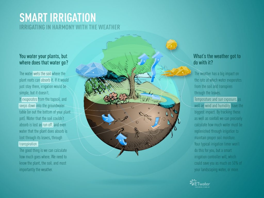 With evapotranspiration in mind, you should only water the amount that is needed after effective rainfall. Today’s “Smart” Controllers do the math for you! Weather-Based sprinkler controllers adjust the system’s run times based on the plants’ watering requirement. Using onsite and local weather sensors, they collect the required information for evapotranspiration and rainfall to determine just how much is needed.